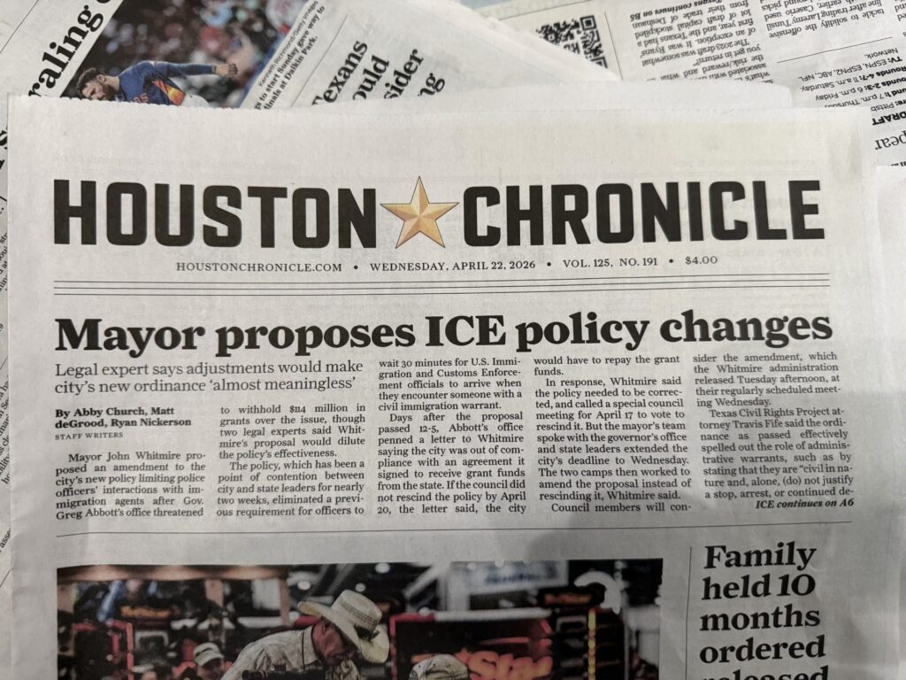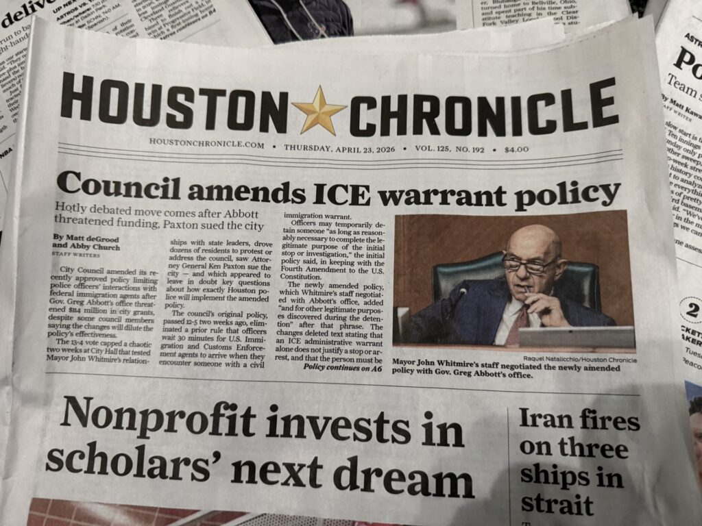 The featured photo says it all. Here is from the Chron front page: Houston City Council amended its recently approved policy limiting police officers’ interactions with federal immigration agents after Gov. Greg Abbott’s office threatened $114 million in city grants, despite some council members saying the changes will dilute the policy’s effectiveness. The 13-4 vote came amid…